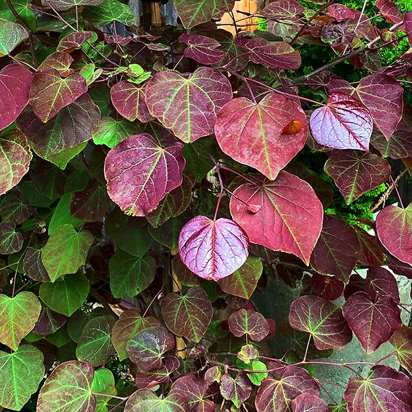 The Black Pearl™ Redbud is a large shrub or small tree that grows rapidly, becoming in time up to 20 feet tall and at least that wide. Within 5 years it will be over 6 feet tall and wide, and won’t take long to reach a substantial size. It forms a multi-stemmed bush, with dense foliage and compact branches, rather than the more open form typically seen in redbuds. Young shoots have smooth, semi-glossy bark that is dark purple. Mature bark is very dark black-brown with a slightly rough surface, and the branches form an intricate and attractive silhouette against the background in winter. The leaves are beautiful heart shapes, 5 to 6 inches long and wide. The surface of young leaves is very glossy, turning softly satin as they mature. The upper surface of new leaves is a stunning dark purple – so dark it is almost black. As the leaves mature they turn to a rich and dark reddish purple, while the undersides are a lighter tone. Unique in this variety, that dark coloring holds throughout the summer months, even in hot zones, until in fall they turn a standout bright yellow with greenish to mustard tones, tinted with pale orange – a lovely show and such a contrast to the dark spring and summer colors.