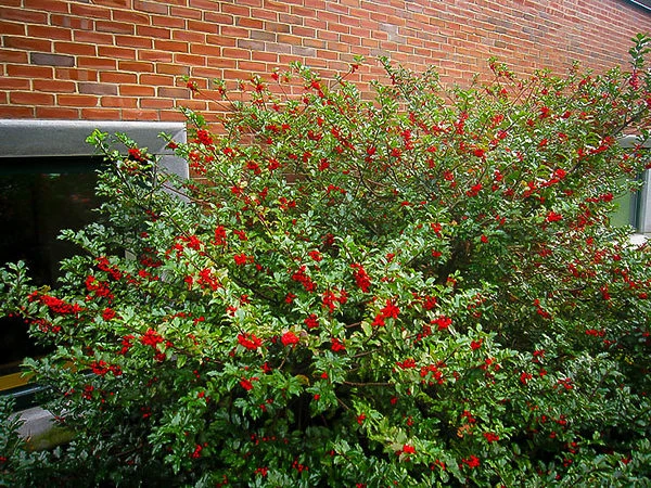 Blue Maid Holly is a vigorous bush that soon reaches 8 to 10 feet tall, with a width of 6 to 8 feet. It has dense growth, and the leaves are large, with a lustrous, glossy surface. The foliage is always a healthy deep green, with a slight bluish tone, intensifying the depth of color. The underside of the leaves is lighter green. The leaves are almost oval, and the margin has several short teeth along it, but it does not have the sharp spines typically of most other holly bushes. This makes it ideal for planting along a pathway, or where you might brush against it, which is impossible with other hollies. In May many small white flowers open, and these develop into glossy, bright red berries by fall. They last well into winter, until they are eventually eaten by birds, providing valuable winter food for them.