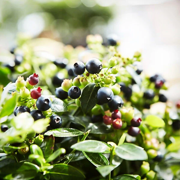 The Blueberry Glaze bush is a complex hybrid blueberry, created in a special breeding program. It combines three types of blueberry bushes: Vaccinium myrsinites, the shiny blueberry; Vaccinium corymbosum, the northern highbush blueberry; and the wild lowbush blueberry, Vaccinium angustifolium. David Brazelton and Adam Wagner are breeders with Fall Creek Farm and Nursery, Inc., of Lowell Oregon, who create commercial blueberry crops. They worked with the famous blueberry breeder Arlen Draper, who specializes in bringing wild genes into commercial crops. Together they crossed many plants together, and in 2008 they selected a unique bush they called `ZF08-095`. This was patented in 2015 and named Blueberry Glaze. It is one of the berry bushes in the new Bushel & Berry® range, created by Star® Roses and Plants to bring easy fruit growing to home gardens without losing ornamental value in the plants.