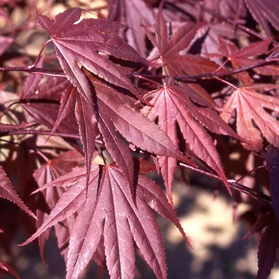 The leaves are up to 5 inches long and wide, divided into 5 or 7 long, narrow lobes which reach right to the base of the leaf. Each lobe is edged in many tiny serrations, with a pronounced vein down the center. Spring color is deep red, more red and not as dark as ‘Bloodgood’, making a spectacular feature in any garden. It also stays red through summer, except in the hottest regions. Even there it keeps its color much longer, and you can expect it to be mid-August before it becomes more bronzy and then a dark reddish-green if you have hot summers. Then, in early fall, as soon as the nights begin to cool, they turn a wonderful, striking scarlet, a fabulous effect you are going to love. Older trees develop clusters of small maple keys, which are deep red, appearing as if by magic as soon as the leaves fall, and brightening the tree through much of the winter.