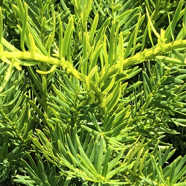 Young shoots are greenish, holding that color through the first winter. The foliage consists of soft, flat needles, 1 to 1½ inches long, ending in an abrupt point, and arranged in two rows more or less spread flat out on either side of the stems. The color of young foliage is bright green, soon turning to a rich dark green that holds through winter. Needles remain on the bush for several years, eventually yellowing and falling in the inside of the plant, mostly invisibly. This is a female plant, so although some small pollen cones may be seen in spring, no red berries are produced.