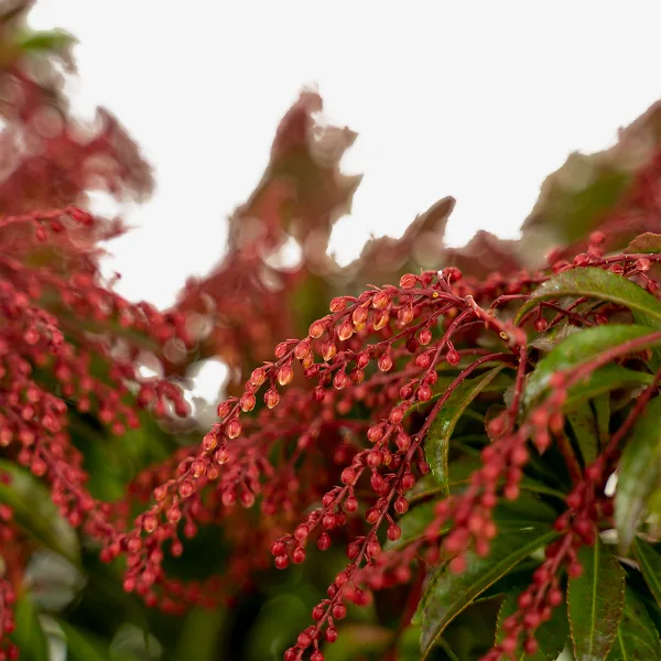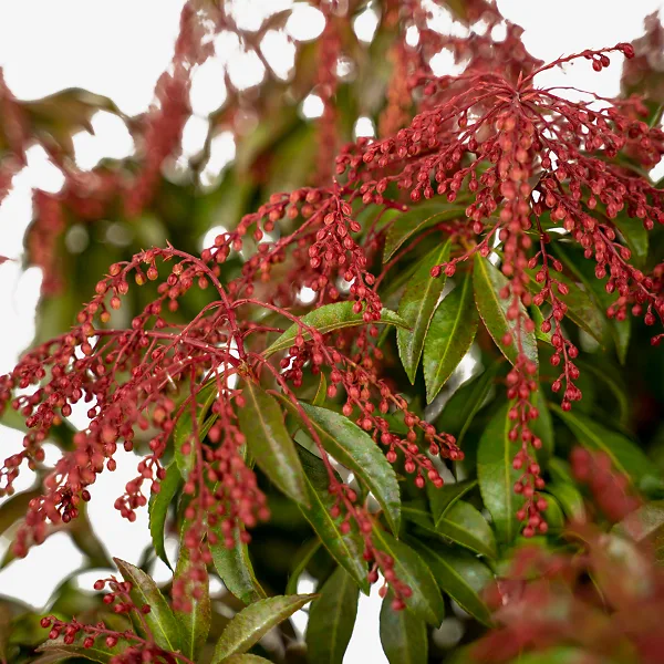 The Dorothy Wyckoff Pieris is a small to medium-sized evergreen shrub, growing steadily into a plant around 5 feet tall and 3 feet wide. The leathery, dark-green leaves are smooth and glossy, about 2 to 3 inches long and 1 inch wide, with very fine serrations along the edge. The new leaves that come just as flowering peaks are a warm reddish color, and in winter, at least in cooler zones, they turn darkly red again. By late fall the first signs of spring flowering can be seen, as tiny red ‘fingers’ clustering at the top of each stem. These slowly develop over winter, becoming clusters of hanging buds with the stems and buds colored a bold dark red. In spring the bell-shaped flowers open all along the 6-inch hanging stems, pink to begin and white when fully open, contrasting with the red stems and flower supports (the calyx). These long clusters resemble the flowers of lily-of-the-valley, a name sometimes used for this beautiful shrub. A plant in bloom is simply gorgeous, with the red and white display obscuring most of the leaves. Blooming lasts about 3 weeks, and towards the end the new leaves break out in clusters above the blooms, flashing glossy and red. The flowers fade to insignificant seed pods.