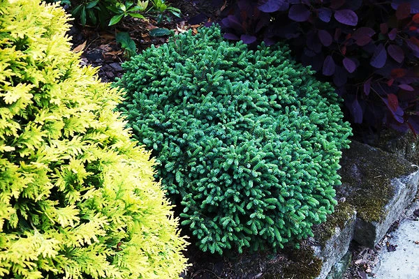 Dwarf evergreens are basic core plants in any garden, particularly in colder areas, where plant choices are more limited. Always popular are rounded and bun-shaped forms, which fit perfectly into so many places in the garden. Tucked between rocks, at the corners of beds, or as sturdy components of the front row of shrubs, these tough and reliable little plants give permanent, year-round structure in any garden, from the simplest to the most detailed. Spruce trees are always popular – they are cold-resistant and always easy to grow – and a constant favorite of everyone is the Dwarf Black Spruce. This selection of a North American plant is guaranteed to look great from the moment it is planted until it reaches its mature status as a striking specimen in your landscape.