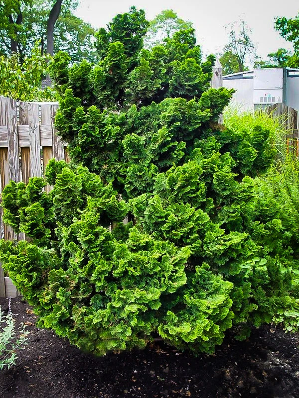 It often seems that the world of evergreen needle trees is divided into two groups – big trees like spruce and pine, and tiny dwarfs and spreading plants a couple of feet tall and often very slow growing. Sometimes we just want something in between – a medium-sized attractive evergreen for foundation planting and filling our beds with interesting plants. Luckily the Graceful Dwarf Hinoki Cypress fills this slot perfectly. This dwarf form of a Japanese native tree will grow at least 6 inches a year to reach 3 feet tall pretty quickly; eventually top 6 feet and finally mature around 10 feet tall and 4 to 6 feet wide. Throughout that time you will have a charming evergreen with rich-green foliage arranged in shell-like clusters, on a slender upright plant with foliage right to the ground.