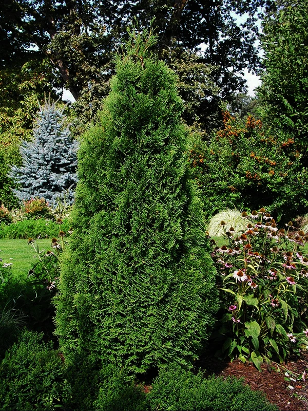 One of the most useful features in a garden, guaranteed to add a touch of grace and formality, is the narrow, upright green column. Many trees grow in this way, usually selections of wild trees with broader habits, but for smaller gardens and in containers, and especially for cold areas, nothing beats the classic Holmstrup Arborvitae.