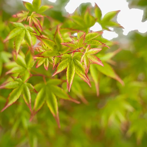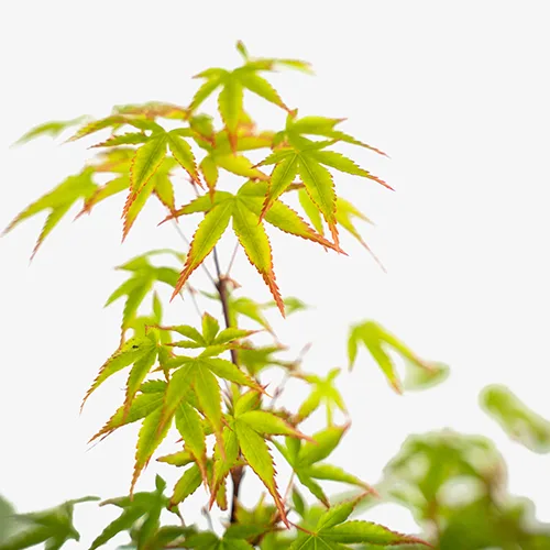 The Kiyohime Japanese Maple begins the year by sending out delicate leaves that are a beautiful clear chartreuse green color, with a deep purple-red border carefully outlining every leaf. As exquisite as the fine painting on a Japanese pot, you will be charmed and enchanted by this unique leaf coloring. As the summer arrives the leaf turns a perfect soft green to cool things down and then kicks into high gear with vibrant bronze and orange shades in fall. The leaves are deeply divided into several narrow lobes and look like a tiny hand.