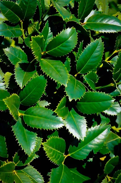 The most striking and unique feature of this holly is the foliage. Instead of the usual ‘holly leaf’ form, with several large spines, the leaves of the Liberty Holly are oval shaped, 3 to 4 inches long and 1½ to 2¼ inches wide. Along the edges is a tight row of short spines, with 15 to 20 spines on each side. This crisp ‘saw-tooth’ edging makes the Liberty Holly very attractive, and quite different from most other holly bushes. The leaves are a very dark, rich green, with a bright, glossy surface, and always look striking and attractive.