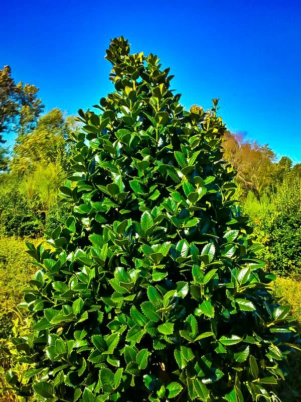 Holly bushes are essential evergreens in all the mild and warmer parts of the country. Their glossy foliage and bright red berries are enduring symbols of winter, and they add interest and color during this darkest time of year. In summer too, they create a strong backdrop to the color of our gardens, and for hedges they simply cannot be beaten. The Liberty Holly is an outstanding holly bush, well-adapted to hotter areas, with striking foliage and bright orange-red berries. It has a naturally pyramidal form, dense growth, and striking foliage that creates a distinctive look. If you are looking for holly bushes for a beautiful hedge, or as specimens in your garden, this is almost certainly exactly what you are looking for.