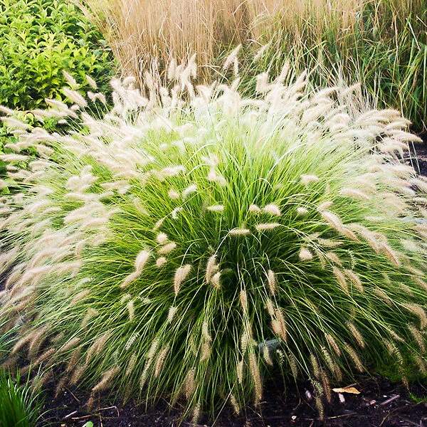 The Little Bunny Miniature Fountain Grass is a clump-forming, non-invasive perennial grass that rapidly forms a tuft of leaves between 12 and 18 inches tall. This arches up and over like water from a fountain, covering an area up to 18 inches across. Each leaf is like a slender straw, ¼ inch thick, tapering to a soft point. It is mid-green to dark-green, but looks very slightly silvery because of microscopic hairs on the surface of the leaf. Many leaves rise from a dense clump, which expands a little with age, but never spreads or becomes invasive in any way at all. It sprouts quickly in spring, and soon looks lovely. Around mid-summer you will see the ‘rabbit tails’ beginning to develop. These rise on slim stems to the very tips of the leaves, and at first they are pinkish, like a fuzzy bottle-brush a few inches long. Gradually they turn to a pale silvery straw color, becoming white-beige by fall and into winter. Often seed-eating birds will flock to it, taking seeds from the heads. The leaves and flowers hold through the cold months, both turning very pale straw colors. Heavy snow and storms may flatten them, but otherwise they normally stay up until spring.