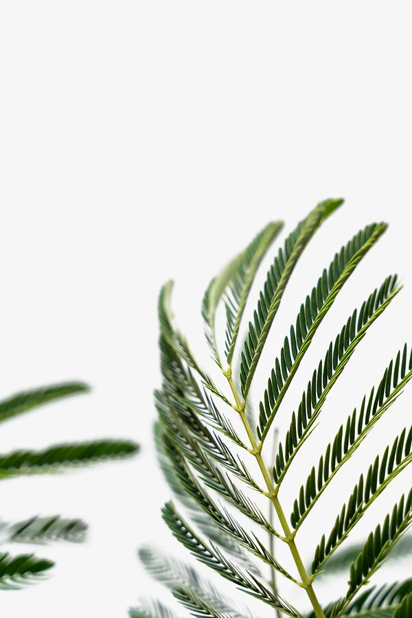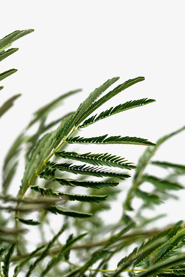 The bark of the stems is smooth and greenish-gray when young, turning darker gray-brown and developing long vertical stripes of lighter brown in older wood. The foliage is extraordinary beautiful and interesting. Each leaf is 10 to 20 inches long, and 5 to 10 inches wide, with a green central stem carrying 4 to 6 shorter stems along each side. Those stems in turn carries 20 to 30 leaflets, ¼ inch long, along each side, giving the leaf a ferny, very divided look. Remarkably, the leaflets can move, and every night this plant ‘goes to sleep’, with the leaflets folding up and hanging down. No wonder Persians call it shabkhosb which means ‘night sleeper’, and the Japanese call it nemunoki, the ‘sleeping tree’. The leaflets will also fold during rain, and when the leaves are shaken, so when you receive your tree it will probably be sleeping inside the box. The leaves are a rich mid-green, and they give the Mimosa Silk Tree a beautiful airy look.