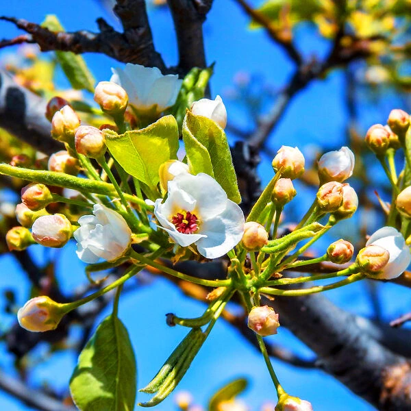 The Orient Pear Tree Is a small deciduous tree growing between 10 and 20 feet tall, depending on how it is pruned, with a spread of up to 15 feet. This tree flowers on bare branches in early spring, in March or April, and the attractive white blooms are small but appealing, with touches of pink on the back of the petals. This tree needs a second tree of a different variety to develop a worthwhile crop of pears. We recommend the Moonglow Pear Tree for this, or in hot zones the Ayers Pear Tree. Each tree will pollinate the other, giving bumper crops. The leaves sprout as the flowering is coming to an end, hiding for a time the small, green fruits than are by then beginning to develop.
