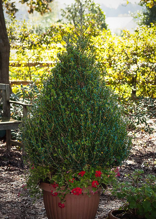 Simple but beautiful evergreen shrubs are a vital part of any garden, but many grow too big for smaller spaces, and can need a lot of trimming. Especially in smaller gardens, and for enclosed parts of your garden, there is a real need for small, attractive evergreens that look great all year round, don’t take up too much room or need constant trimming, and that can be grown in the ground or in boxes. Now we have the answer. For small spaces in your garden, or in boxes beside the door or on your patio, we are thrilled to be able to offer you the Patti O Box™ Japanese Holly. This cute little lady will bring you just the green accent you want, without growing too large, and without needing lots of care – perfect for a busy gardener in a small town-garden, or even if you only have a balcony and want some permanent planting that won’t need any significant work.
