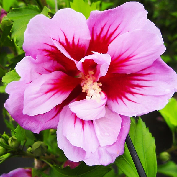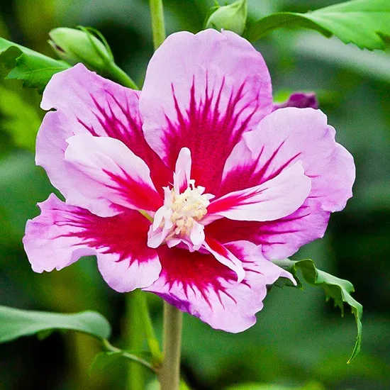 In the warmest parts of the country blooming can begin in June, and a few weeks later in cooler areas. Once it starts it goes on and on without a rest, until the first hard frost – perhaps in November – brings it to an end. Each bloom lasts up to 4 days, and new ones keep opening, without a pause, making a column of blooms you won’t believe. The blooms are large, a full 4 inches across, shaped like a shallow bowl, in a beautiful shade of violet-pink – a light purple. The center of the flower is a rich purple-red, with rays like the sun radiating out into the purple. The first flowers have a dense center made up of many small twisted petals, forming a beautiful semi-double flower, and partly obscuring the central blotch. Later in the season the blooms become single, with a long central column of pollen-bearing stamens, like the traditional Rose of Sharon bloom – just as beautiful, and you get two types of blooms on the same bush. No seeds are produced, so the blooms just fall off cleanly when they are over, and none of the plant’s energy is wasted in seed production, so blooming never stops.