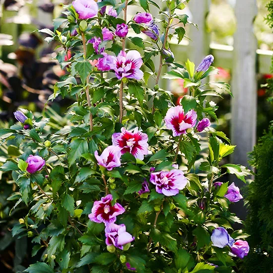 One of the most eye-catching garden features is the slender green column. We are used to seeing it in evergreens, with narrow junipers, for example. There are others too, from columnar oaks and ginkgo trees to boxwoods, but columns of flowers are much rarer, unless you carefully train a climbing rose, or a vine. That’s why everyone greeted with pleasure and amazement the arrival of the Purple Pillar® Hardy Hibiscus. Often called Rose of Sharon by many gardeners, these colorful shrubs have been garden favorites for hundreds of years, but they are all rounded bushes, often even wider than they are tall. Not the Purple Pillar® Hardy Hibiscus. This amazing bush will shoot up to 6 feet, then 10 feet, and even to over 15 feet tall, yet it stays incredibly slim – and it does it without any training, trimming or needing support. The strong stems almost never branch out sideways, but they develop short spurs that carry bloom after bloom after bloom, a wonderful violet-pink with a big purple-red eye. It blooms for months and it really is a show-stopper, yet just as easy to grow as any Rose of Sharon – and that’s easy.