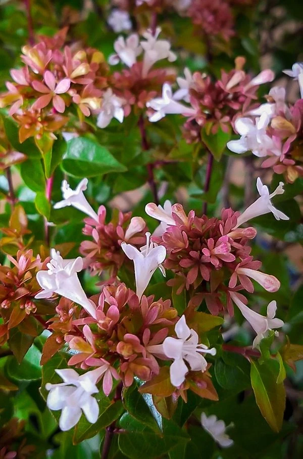 The Rose Creek Abelia is a rounded, dense shrub, growing no more than 2 or 3 feet tall, and spreading 3 or 4 feet wide. It really fills spaces, and just a few will cover a large space with beauty, while their density excludes weeds and hides the soils. The crowded stems are red, covered with round-oval leaves the size of values. These emerge in spring, and on new growth, tinted pink, and turn to a rich, glossy deep green by early summer. That healthy color persists into fall, before turning interesting tones of purple-green as the colder nights arrive. In zones 7 to 9 it is fully evergreen, and in zone 6 it will shed some leaves, becoming semi-deciduous is the temperatures fall low enough.