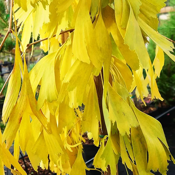 The Saratoga Ginkgo Tree is a unique deciduous tree that grows into a pyramidal form, reaching when mature a height of around 40 feet, with a crown that is around 30 feet across, significantly more compact than seedlings or many other named varieties of this tree. The growth rate is relatively slow, and this is a tree to plant for the future, with an expected life of at least 150 years. The bark is an attractive light gray-brown, with deep vertical furrows and ridges giving it a lot of rugged character. The leaves are evenly spaced along new shoots, while on older stems they grow in clusters from short, knobby spurs. Each leaf is about 3 inches long and up to 3 inches wide at the end, and this variety has a characteristic long, slender tapering form to the leaves, which makes them slightly pendulous. The end of the leaf is divided into two distinct lobes. The foliage is a bright, clear green, and holds that color beautifully all through spring and summer. In fall the leaves first turn lime-green and then the whole tree becomes a gorgeous glowing sentinel of butter gold, making a wonderful display of uniform color that can last several weeks. Ginkgo has separate male and female trees, and females produce a fruit that is renowned for its terrible smell. The Saratoga Ginkgo Tree is a male tree, and it doesn’t produce fruit, so you have no worries in that department.
