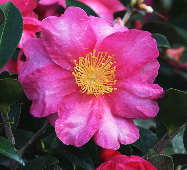 When it comes to garden must-haves, the ‘Shi Shi Gashira’ Camellia is a no-brainer. In terms of beauty, few other adaptable low-lying shrubs exist that can produce such stunning flowers. Large magenta blooms, nearly 3 to 5 inches in diameter, embellish the glossy green serrated leaves of the Camellia, which eventually reaches about 5 feet in height. Each dark pink flower is accented with bright goldenrod-colored stamens centered in each bloom. The petals appear to double in number, adding texture and variety to the display.