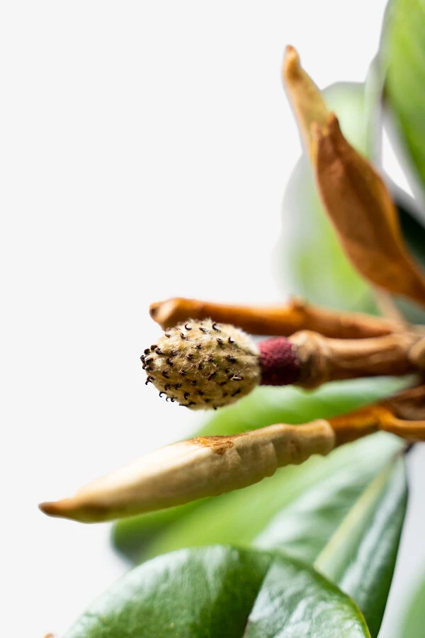 The bark of the tree is smooth and a light shade of gray, becoming darker and a little rougher as the tree matures. In May or June you will see the first flowers, and these are produced steadily for most of the summer. They are 5 to 6 inches across, and the thick, crystal-white petals open flat, showing a central spike of flower parts, and releasing a rich, heady perfume. In fall you may see unusual structures a little like pine cones on your tree. These are the seed pods, and in late winter you may see them open to reveal bright red seeds, which later fall to the ground.