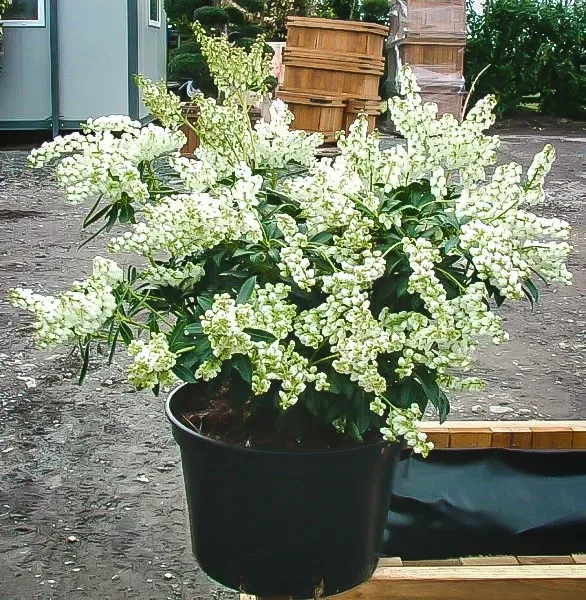 If you don’t have suitable soil in your garden, you can to grow the Temple Bells Pieris by applying chelated iron in spring and fall, if your soil is neutral. An easier solution is to grow it in a planter, trough or large pot. You can create a lovely planter for a shady patio using this plant along with Encore Azaleas and one or more of our selection of camellia bushes. All of them with thrive if you fill the planter with soil blended for acid-loving plants, and feed them regularly with liquid fertilizer for acid-loving plants. Make sure your planter has drainage holes, and water as soon as the surface becomes a little dry. Combining these plants will give you blooms for many months of the year.