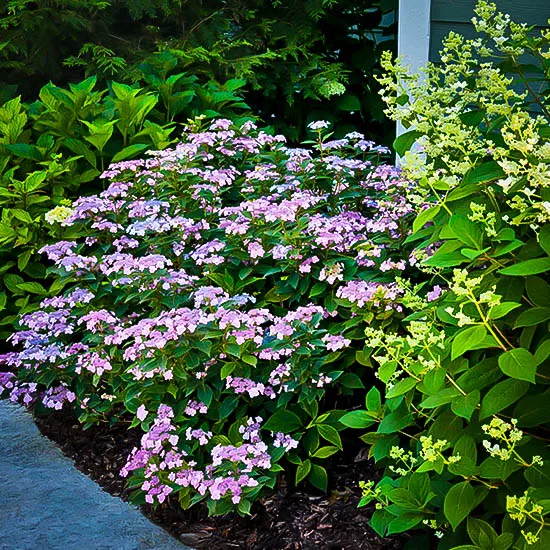 The Tiny Tuff Stuff™ Mountain Hydrangea grows into a low, mounding plant, up to 2 feet tall and 2 feet across, but never taller. This makes it an ideal choice for a smaller garden, or for planting as an edging in front of taller plants. A border of this beauty along a pathway would be wonderful. To plant as a row, space the plants 18 inches apart, and they will grow together into a continuous, flowing ribbon.