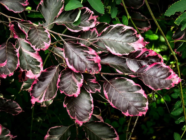 The Tri-Color Beech is a special form of the European Beech, Fagus sylvatica. That tree grows across Europe and Britain, sometimes making whole forests, and sometimes mixed with other trees like oak. There are several forms with purple leaves, but the Tri-Color Beech is unique for its pink-purple leaves, such as we see in no other tree. It seems that this variation, which is basically a variegated leaf, but with a purple/pink, rather than the much more common green/white effect, has occurred several times. First in France and Holland in 1885, then again in 1888, and several times since then. North America is fortunate, because the American version, which may have originated before 1970 in Oregon, is very superior to European forms, and is the crème de la crème of an already beautiful and remarkable tree.