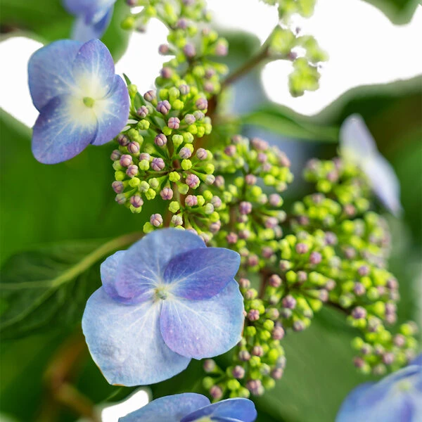Mop-head hydrangeas are beautiful, there is no doubt, but if you have every struggled to hold them up after a summer rainstorm, you know they are not always easy to grow well. Plus, they are green for quite a long part of the season, often only blooming later in the summer, or earlier but then followed by green leaves. We have an answer for both those problems, with a beautiful hydrangea of the lace-cap type, which has lighter blooms that hold up well in adverse weather. Plus, this great plant blooms continuously, from late spring to fall, because it produces flowers on both old wood and new wood, while other kinds only do one or the other. With this wonderful shrub summer starts early, and never ends until frost finally stops your plant blooming. It’s enough to start you dancing, so no wonder this great plant is called the Twist-n-Shout™ Endless Summer® Hydrangea.