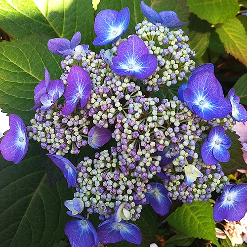 The flower heads of the Twist-n-Shout Hydrangea are of the type called ‘lace-cap’. They contain a central part of almost 400 tiny ‘fertile’ flowers without petals, surrounded by over 20 large, ‘sterile’ flowers measuring 1½ inches across with a tiny value center and 4 flat petals. The effect is of an old-fashioned lady’s hair-cap, made of hand-woven lace. The color varies with your soil type. In alkaline soils the flower-head is gorgeous pink, with the outer flowers paler than the central ones. In neutral to slightly acidic soils they will be purple-pink, and in very acidic soils they will be periwinkle blue.