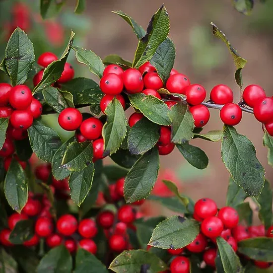 In spring, among the new leaves on older stems, you might catch a glimpse of the tiny white flowers that form in clusters. If pollinated they turn into tiny green berries, growing slowly through summer and turning red once fall arrives. They really jump into the picture once the leaves fall, and this variety is one of the very best available for producing an abundance of berries – a bumper crop of color. Branches can be cut for holiday decoration in wreaths or vases, and it means that even in cold zones you can have your own Christmas holly. This variety is remarkable for the persistence of its berries, even into spring.